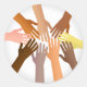 Illustration of a group of diverse hands from different cultures and nationalities reaching out and touching each other. Conceptual design showing people coming together and giving each other help and support. Image available on various gifts and products.