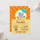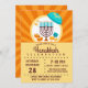 Bright, colourful Hanukkah party design with orange rays, menorah, gelt, dreidel, sufganiyah doughnuts, and yamaka.