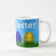Happy Easter illustration featuring colourful painted Easter eggs in the grass with the blue sky in the back and "Happy Easter" typography written with white clouds.