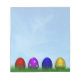 Happy Easter illustration featuring colourful painted Easter eggs in the grass with the blue sky in the back.