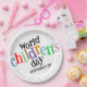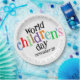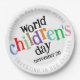 Celebrate World Children's Day with these commemorative paper plates, which feature the celebration "World Children's Day" in a colourful spectrum of playfully skewed letters, surrounded by wrapped text (the message for 2024) on the top and bottom.