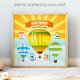 Baby room birth announcement Poster featuring modern typography and cute hot air balloons on a bright sunrise background. Add all your lovely details on this easy-to-use template to make your own unique birth stats Poster.