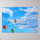 A vibrant photograph capturing colourful hot air balloons floating gracefully against a bright blue sky filled with fluffy clouds.