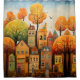 A scene of cute houses nestled amidst a tapestry of foliage, ablaze in hues of orange, blue and bronze. The terraced cityscape cascades with a sense of quaint charm, each building adorned with its own unique character.