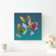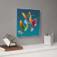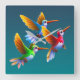 AI generated artwork of colourful, pastel-hued hummingbirds in flight on an ocean blue background.