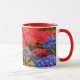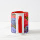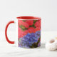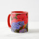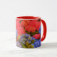 This pretty mug features my original photograph of Hydrangea garden flowers in colourful tones. The handle and inside of the cup are a red tone to complement the artwork.