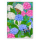 Original fine art design of colourful butterflies on Hydrangea macrophylla flowers by artist Carolyn McFann of Two Purring Cats Studio printed on a quality greeting card for nature lovers.