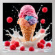 A vibrant still-life image featuring a tri-coloured ice cream cone surrounded by dynamic milk splashes and fresh raspberries, conveying a delicious and fun atmosphere.