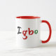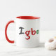 A colourful Igbo Pan African mug, this design features "Igbo" displayed in black, red, and green font. The inside of the mug features red with a matching red handle. Customise yours today!