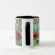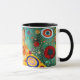 The image on this unique and colourful mug is a ginger orange cat with bright blue eyes. The painting is done in a Klimt style in additional colours of teal blue, red, and brown. One bottom side has a text field where you may add your name or monogram.
