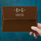 Colourful leaf print and initials brown wedding envelope. The outside of the envelope is of dark brown colour with your initials and address in white on the flap. The inside includes a colourful leaf print pattern. If you want an envelope liner you can delete the leaf print and use the one available in our "leaf print" collection.