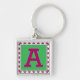 The capital letter 'A' is done in a fuchsia-colour on a bright green background. The border picks up on the fuchsia-colour of the letter and has a diamond-shape design all around the edge in fuchsia and white.
