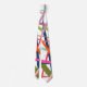 This tie has a geometric design of scattered lines in floral colours – shades of pink, orange, yellow, blue, and green.