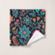 This seamless pattern features a variety of colourful flowers and leaves on a dark background. The flowers are in a variety of colours, including red, orange, yellow, pink, purple, and blue. The leaves are blue and grey.