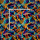 This is a colourful multicolored blue, violet, red, yellow, orange, black and cyan abstraction pattern in liquid ink on a light beige background.