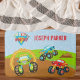 Add a bit of fun to your little boy's bathroom with this cute bath mat that has three colourful monster trucks. There is a green monster truck driving through a ring of fire, a red monster truck watching, and a blue monster truck jumping over a dirt pile. There are also chequered racing flags in the top left and your child's first and last name in the top right.