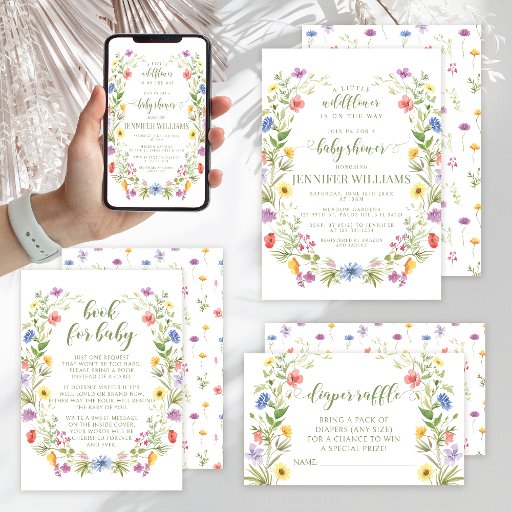 Experience bohemian elegance with this square baby girl shower invitation, adorned with a vibrant meadow wildflower wreath and accented by simple and light green calligraphy script. Capture the essence of joy and celebration for the upcoming arrival.