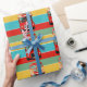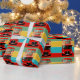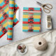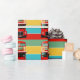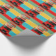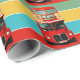Wrapping paper (gift wrap) using strong bands of colour and a photo of the iconic double-decker bus of London photographed in the mid 1990's.