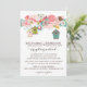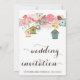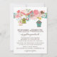 Illustrations of two pink and brown love birds surrounded with whimsical spring flowers and blue, pink and green hanging bird houses. Very cute and whimsical perfect for summer and spring weddings.