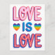 Celebrate love in all its forms with this vibrant "Love Is Love" postcard. Featuring bold, rainbow-accented text and colourful hearts, this design is perfect for showing support for LGBTQ+ rights and equality. Send this postcard to a loved one or use it as a decorative piece to proudly express your commitment to inclusivity and acceptance. Whether it's Pride Month or any time of year, this card is a heartfelt way to spread positivity and love.