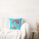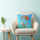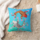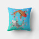 Colourful Asian inspired accent throw pillow, with graphic artwork of two luck carp swimming around pink flowers, on a blue and aqua background.