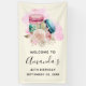 A birthday welcome banner with a delightful image. 3 colourful macarons, pink, green and blue with a fancy rose floral bouquet and a splash of pink watercolor behind. Delicious and stylish too! Light yellow background.