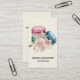 Business cards with a delightful image. 3 colourful macarons, pink, green and blue with a fancy rose floral bouquet. Delicious and stylish too!