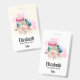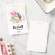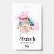 Personalised name badge with a delightful image. 3 colourful macarons, pink, green and blue with a fancy rose floral bouquet and a splash of pink watercolor behind. Delicious and stylish too! Light yellow background.