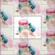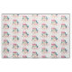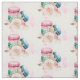 Fabric with a delightful image. 3 colourful macarons, pink, green and blue with a fancy rose floral bouquet and a splash of pink watercolor behind. Delicious and stylish too! Light yellow background.