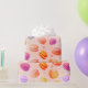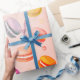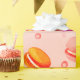 Colourful Macarons in a watercolor style pattern on a pink background.
