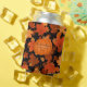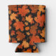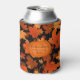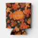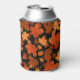 This maple leaves pattern neoprene canned beverage cooler features a colourful fall pattern of varied size maples leaves in orange, gold and brown arranged randomly on a black background with a pumpkin on the front, on which your celebration details can be customised - by katz_d_zynes