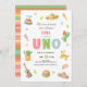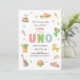 No time to siesta, it's a fiesta! This fun first birthday invitation features watercolor illustrations of fiesta items like sombreros, tacos and clothing. The UNO is a Mexican patterned font in pastel red, green and blue. The back of the invitation is modern version of a classic serape fabric.