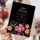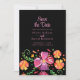 Embrace elegance with a touch of vibrancy through our "Colourful Mexican Floral Fiesta Save the Date Card" against a striking black background. The lower half blooms with hand-painted watercolor flowers in shades of orange, red, and purple, exuding energy and celebration. The upper portion presents your crucial save the date details in a refined, soft pink text, creating a captivating contrast against the dark canvas. This design radiates sophistication and festivity, offering a bold and stylish way to announce your upcoming special occasion.