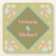 Colourful Mod Embroidery Coasters. Features hand drawn embroidery flowers in pretty pastel colours with green background and squiggle lines. Great folk art feel and perfect for a boho, modern, bold coloured, fiesta, garden or artisty couple. Hand drawn illustration by McBooboos. All wording can be changed to fit your needs. To make more changes go to Personalise this template. On the bottom you’ll see “Want to customise this design even further? Click on the EDIT using Design tool. From there you can change some of the fonts & some colours, move things around or delete what you need.