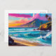 A vibrant, modern abstract painting depicting a beach landscape, where bold, swirling colours evoke the movement of waves crashing against the shore. Bright turquoise and deep blues represent the ocean, while splashes of warm oranges, pinks, and yellows symbolise the setting sun casting its light across the sand and water. The abstract forms blend together in a dynamic, fluid style, capturing the energy and tranquillity of the seascape. Loose brushstrokes and layers of texture create depth, allowing the viewer to feel both the calm and motion of the beach scene.
