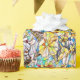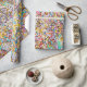 Colourful, modern wrapping paper design for birthdays or any occasion features a seamless pattern in watercolor flowers. The main colours are soft pink, blue, green, yellow, and white.