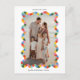 Inspired by eclectic textile seam binding and the on-trend wavy border frame elements loved by all, this portrait photo Christmas holiday postcard is modern but chic with a rainbow of coloured blocks framing your best photo. Simple and clean text is easily personalised with your ideal holiday greeting, names and the backer features a coordinated multi colour accent frame, return address and space for a short update message geared towards family and friends.