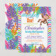 A fun and bright monkey themed birthday party invitation. If your little monkey is having a birthday, this colourful design is just the thing. Jungle leaves in purple, orange and green - with a cheeky monkey. Change the age, name and party details to suit your event.