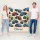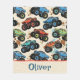 This dynamic monster truck pattern boys' blanket features a repeating design of colourful red, blue, and teal monster trucks catching air, with realistic mud splatters. It is perfect for young racing fans and truck enthusiasts.
