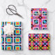 Set of three wrapping paper sheets with different patterns. Each pattern features geometric shapes in magenta, turquoise, yellow, black and white.