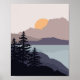 Abstract illustration of colourful mountain lake sunrise with sun, mountain peaks and pine trees decoration for everybody who likes nature, camping, hiking etc.