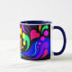 The first of 4 mugs with coloured handles and insides. The design on this one has hearts, bubbles and swirls in bold, pretty colours on a black panel. The handle and inside are navy blue.