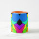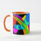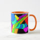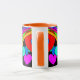 The 2nd of 4 beautiful, colourful mugs. The design is an abstract of hearts, rainbows, dots and more in bright, fun colours on a black panel. The handle and inside are orange.