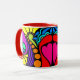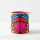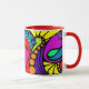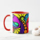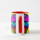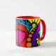 The 3rd in a series of 4 beautiful, colourful mugs. The design is an abstract of hearts, swirls, dots and more in bright, fun colours on a black panel. The handle and inside are red.