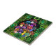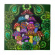A tile with colourful psychedelic mushrooms surrounded by green paisley and green mandalas.