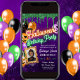 This glamourous Colourful Bold Halloween Birthday Party Flyer features a gradient purple background with glittery spiderwebs and colourful Halloween-themed balloons, giving it a festive yet spooky vibe. The neon text effect adds a modern touch, while the gold baroque frame is perfect for showcasing your own photo or logo. Ideal for upscale Halloween parties, costume events, or themed birthday celebrations.