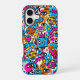 Upgrade your tech with some retro-future cool. This high-quality glossy case for the iPhone 16 case features a maximalist pattern of stylized neon robots, all-seeing eyes, stars, and hearts set against a vivid spray-paint background. A great gift for tech lovers and sci-fi fans.
