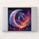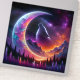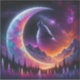 Wolf howling, a crescent moon, colourful sunset landscape trees flowers