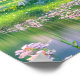 In this digital artwork, we are presented with a small Japanese house nestled in the heart of nature. The surrounding environment is breathtaking with cherry blossom trees, lush greenery, and a grand mountain range that serves as a magnificent backdrop. The calm and tranquil river, which flows lazily in the foreground, adds to the serene atmosphere of the scene.