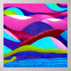Colourful abstract landscape of hills and an ocean in colours of pink, purple, blue, green, and cyan.